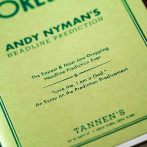 “He started with a classic, time-tested approach to the headline prediction then shaped it into something new and better. Everyone knows that Andy is a world-class performer, creator, writer, actor and director. What many may not know is that Andy can also be a world-class worrier, which means that he imagined every possible performance scenario, good and bad, then developed smart, powerful and sure-fire ways to eliminate every ounce of risk while increasing the impact and drama. Anyone interested in the headline prediction (or any type of prediction) will benefit by reinvisioning this mentalism classic through the eyes of Andy Nyman.” – Michael Weber